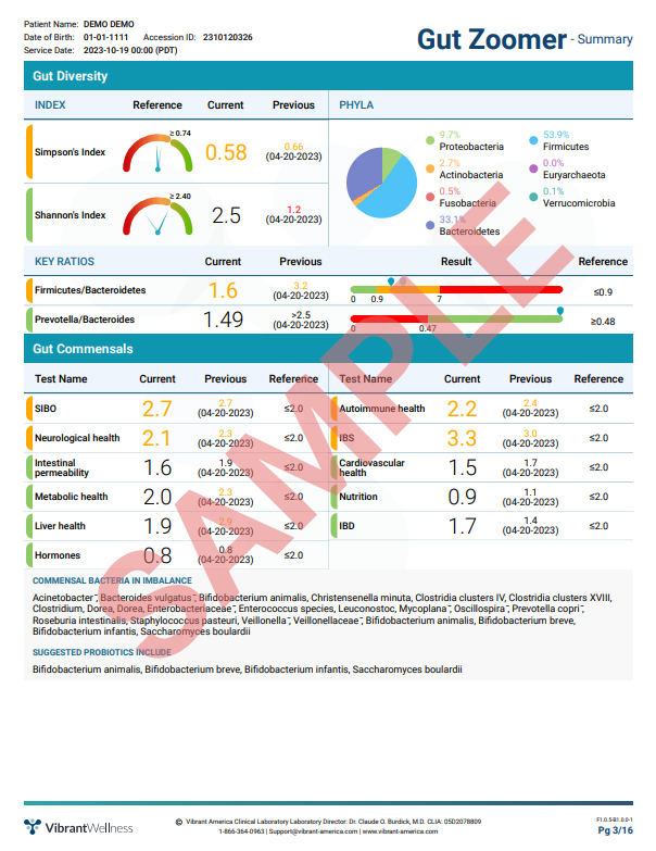 The Vibrant Gut ZoomerTM also provides patients with an actionable report that includes dietary recommendations and other natural supplementation like prebiotics, probiotics, and polyphenols.